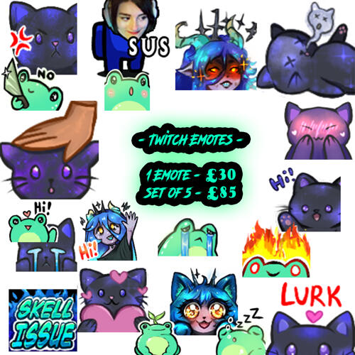 Places you can get my art! Commissions are currently OPEN. I have a temp shop for merch and I do digital Twitch Emotes!